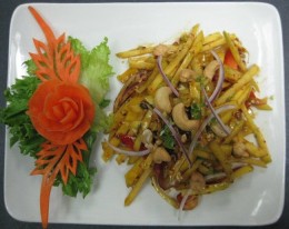 Shredded green mangoes, shallots, sweet peppers, peanuts and coriander tossed with a syrup dressing and topped with cashew nuts.