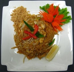 Thai noodle stir-fried with shrimps, chicken and topped with beansprouts and green onions.